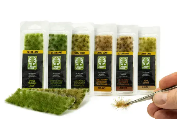 These two-coloured tufts combine medium and extra long static fibres (6.5 and 12 mm) to create a lively, voluminous and natural look. They are particularly suitable for larger modelling scales, but also perfectly usable on H0 layouts, where they can represent bushy vegetation, tall grass clusters or lush greenery along roads, tracks or in rural areas.